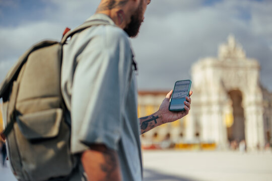 Tourist using navigation app on smart phone in lisbon, portugal