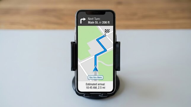 Smartphone displaying active GPS navigation on screen, showing clear route lines and location markers, conveying travel guidance, mapping, direction finding, and mobility concepts