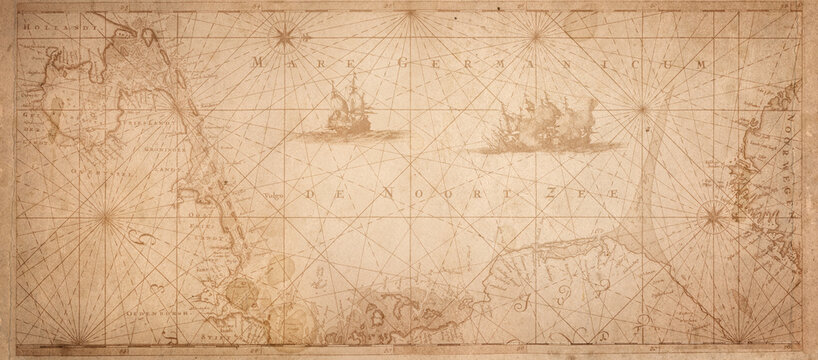 Old map collage background. A concept on the topic of sea voyages, discoveries, pirates, sailors, geography, travel and history. Effect of overlay on old texture of paper.