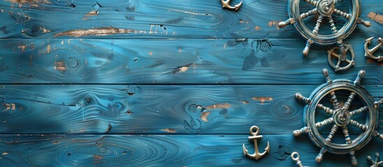 Top down view of blue wooden planks adorned with decorative anchors and steering wheels creating a nautical theme with space for text in the image. Creative banner. Copyspace image