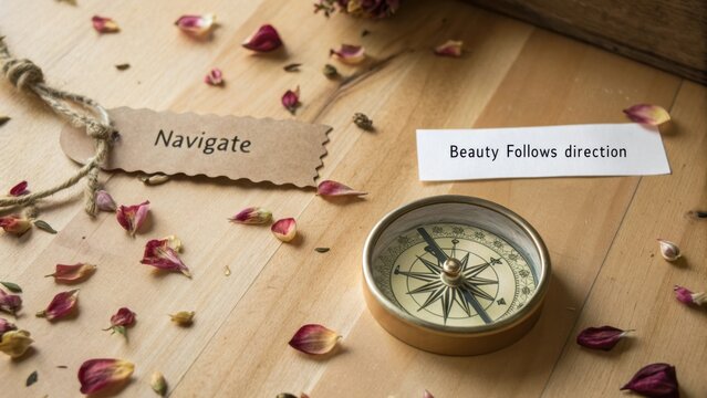 Rustic compass on wooden table with rose petals and navigation tags representing guidance and beauty in nature