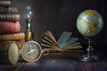 Old earth globe, compass, books and lamp on the table. In the cabinet of a traveler, explorer, investigator, discoverer. Concept on the theme of travel, world exploration, antiquity, history