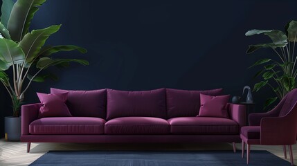 Huge modern living room with viva magenta trend accent sofa and details. Large dark blue navy background and chair. Mockup premium interior lounge design office or home. 3d