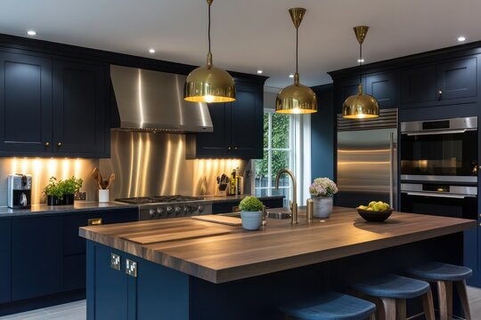 A luxurious modern kitchen with navy blue cabinetry- gold pendant lighting- and an elegant island- combining contemporary design with chic- upscale finishes