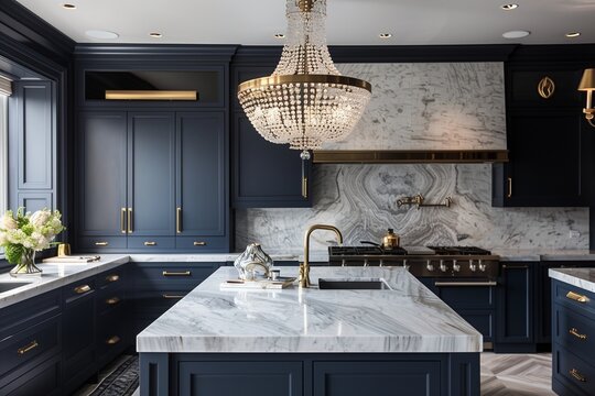 /imagine A luxurious kitchen with marble countertops, custom cabinetry in deep navy blue, and brass fixtures. A large chandelier hangs over the island, adding an elegant touch.
