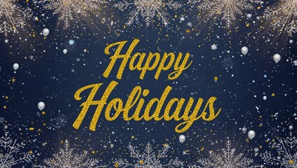 Displaying centered gold-glitter Happy Holidays script glowing on navy card, flakes confetti pearls
