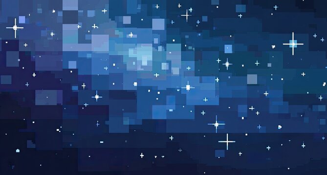 Pixelated space backdrop. Blue shades and shining stars fill the dark canvas