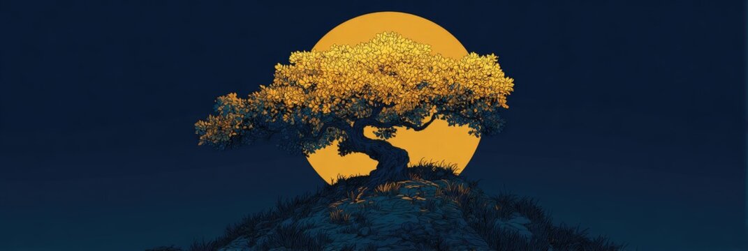 A bonsai tree atop a hill, bathed in the warm glow of a large, golden-yellow moon at night. Deep navy blues and muted greens create a peaceful atmosphere