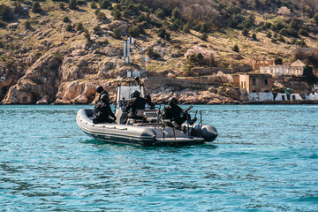Group of military soldiers or SWAT in black uniform, masks and weapons on special navy boat on sea