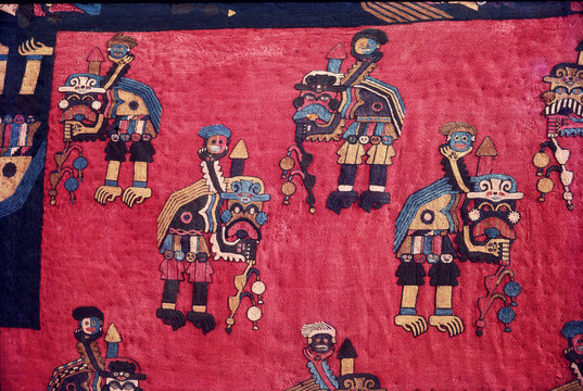 Ica  paracas  Peru -April 2016 -the culture nazca with details of textil figure mithical, being horrible bird, mithical killer ,spotter cat from 100bc to 800 ac  aequeological site and history