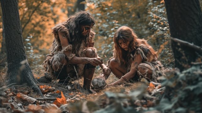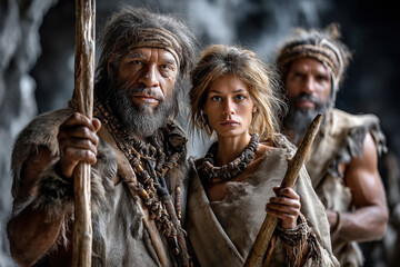 Prehistoric tribe with tools in cave setting, people at Stone Age depicting ancient human lifestyles and survival techniques, concept of neanderthal family, caveman.
