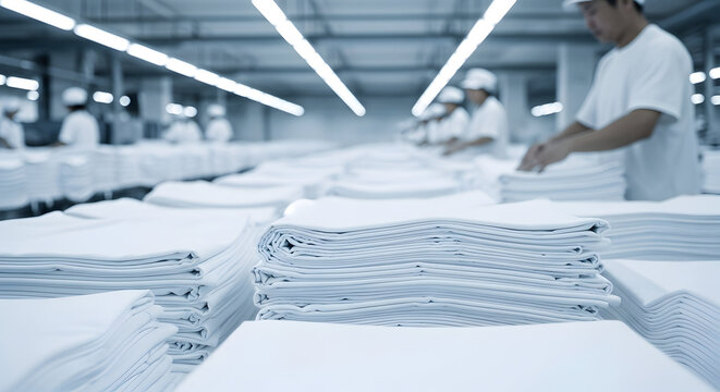 Industrial laundry process with neatly folded white linens and workers in background