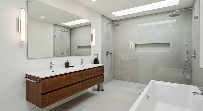 Woman styling hair in modern bathroom mirror reflection