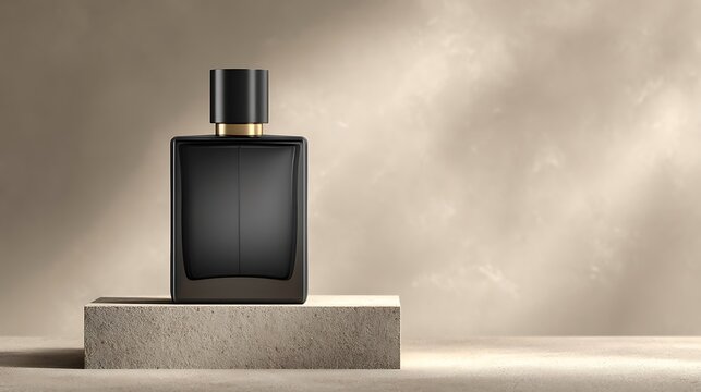 mockup of a plain black perfume bottle neatly placed on a podium on a neutral background, Ai generated Images .