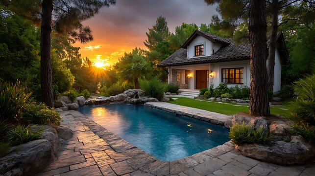 Sunset over a tranquil backyard pool beside a two-story residence, with a tiled patio area and a neatly trimmed lawn. , full ultra HD, high resolution