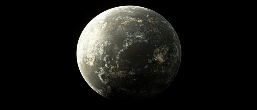 Dark, grey planet with light patches, isolated on black background.