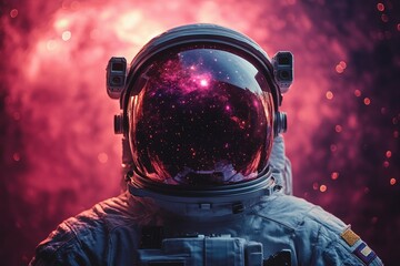 Astronaut is exploring a new planet with a pink nebula reflecting in his helmet visor