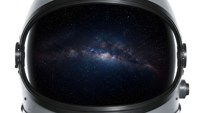 Astronaut helmet view of galaxy and stars in deep space for exploration and adventure theme imagery on transparent background