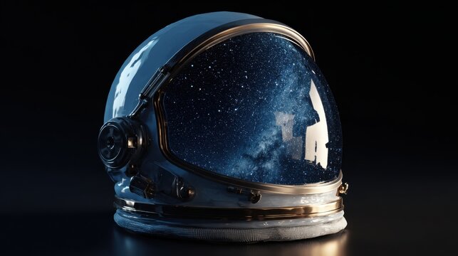 A reflective astronaut helmet showing a nebula galaxy inside the visor on a dark background space theme