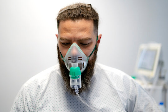 Patient wearing an oxygen mask with nebulizer undergoing respiratory therapy in hospital room