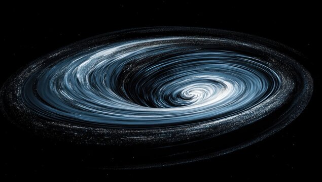 A swirling galaxy with blue and white nebulous clouds against a dark background.