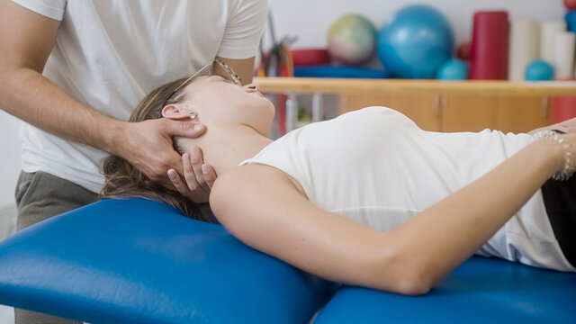 Close-up shot of a male physiotherapist doing manual neck stretching to a young Caucasian female patient.