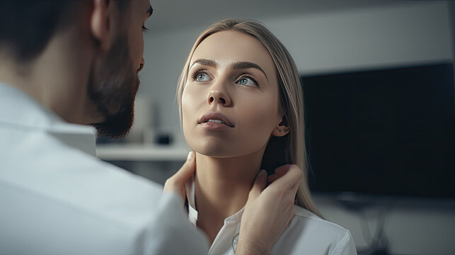 Doctor palpating patient neck for thyroid examination, close-up clinical consultation