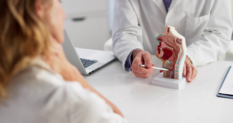 Professional female doctor performing a physical neck examination on a male patient in a clinic. Healthcare specialist checking lymph nodes and thyroid during a medical consultation and checkup.