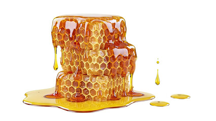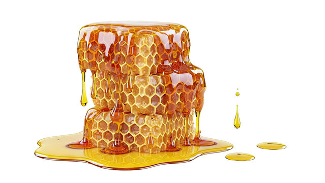 Honey drips down the honeycomb as bees buzz around white flowers set against a vibrant yellow background, showcasing nature's bountiful food source
