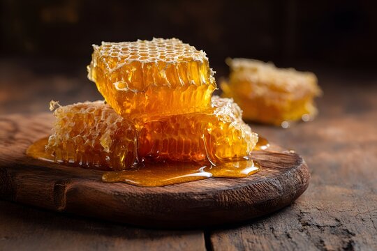 Golden honey comb chunks drip sweet nectar on a rustic wooden board.