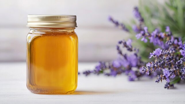 A honey jar beside a blooming lavender plant, emphasizing floral source and natural purity, soft light