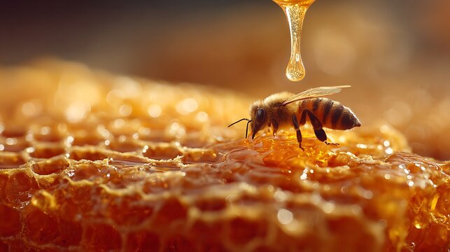 A bee collects nectar from a honeycomb with a drop of golden honey falling above