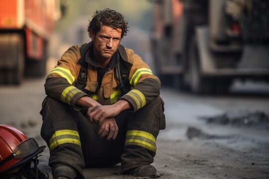 Hardworking hero: a fireman in need of rest post-firefight.After fight with fire concept.