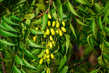Fresh Neem fruit on tree with leaf on nature background, A leaves of neem tree and fruits growing natural medicinal