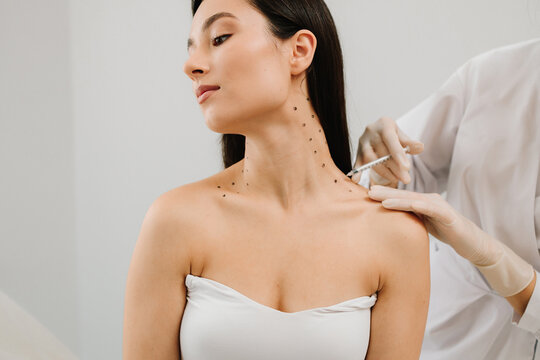 Cosmetologist is drawing dotes before botulinum toxin injection in platysma of girl. Nefertiti lifting injection in marked dotes on the neck.