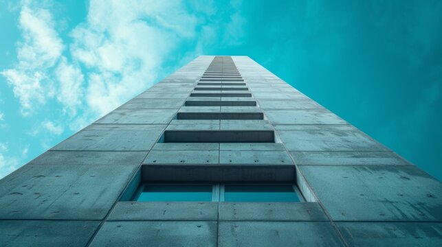 Low angle view of a Neo Brutalist building rising into a vibrant blue sky