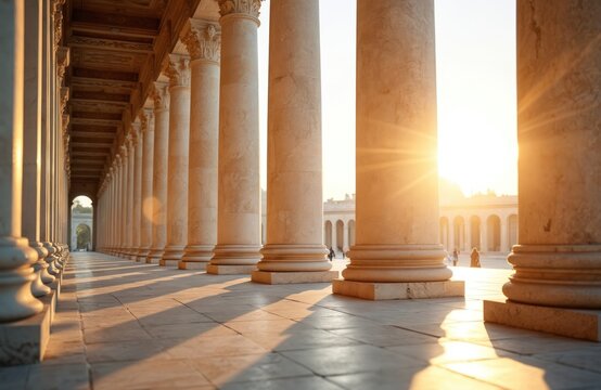 Stone columns line building walkway at sunset. Sunlight beams through architecture, casting long shadows on paved ground. People stroll past classic facade, suggesting history and travel.
