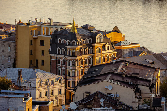 Modern neoclassical building with golden spire on Dnipro river embankment in Podil. Urban architecture at sunrise with warm morning light over historic district in Kyiv city area, Ukraine.
