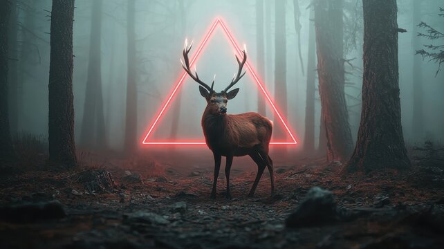 A mystical deer with glowing antlers holding a transparent holographic sign, ethereal colors, neon highlights, futuristic dreamlike style.