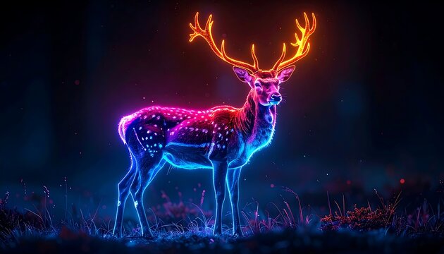 A digital illustration of a stag with glowing antlers and body, standing in a grassy area with a dark background, illuminated with vibrant neon colors