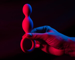Islamic praying. Traditional tasbih. Unrecognizable woman with wooden rosary beads in vibrant pink neon light on red empty space background.