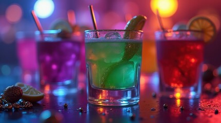 Vibrant Festive Mardi Gras Beverage Cocktails neon cocktails in Carnival Colors garnished with edible glitter and citrus slice