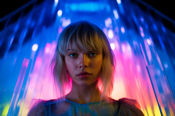 Neon Glow Portrait of Young Woman in Colorful Light Generative AI image