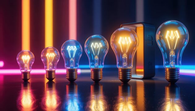 Variety of light bulbs with different glow on a dark surface in a modern setting Generative AI