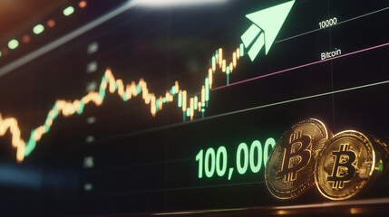 A stock market chart with Bitcoin on top, displaying rising and falling candlestick charts.