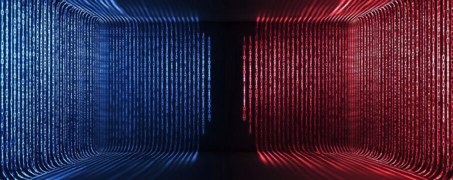 Abstract Binary Code Background With Blue And Red Bokeh. Technology, Digital, Data, Coding, Futuristic, Abstract.