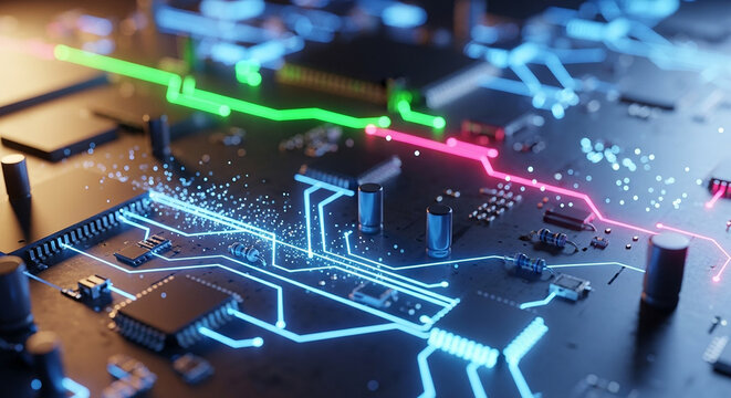 A macro view of a computer circuit board with glowing neon pathways of data in blue  green  and red  flowing between microchips