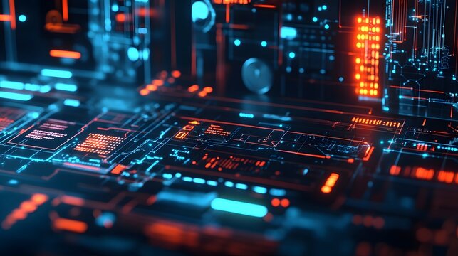 Futuristic orange and blue technology background featuring circuit board patterns, digital code elements, and high-tech abstract design for modern innovation themes and sci-fi aesthetics.