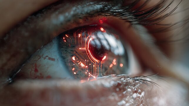 A close-up of a human eye with a futuristic red circuit board design visible in the iris, symbolizing advanced technology and artificial intelligence.