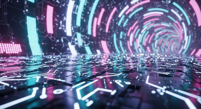 Futuristic digital interface with neon sh apes and circuit patterns